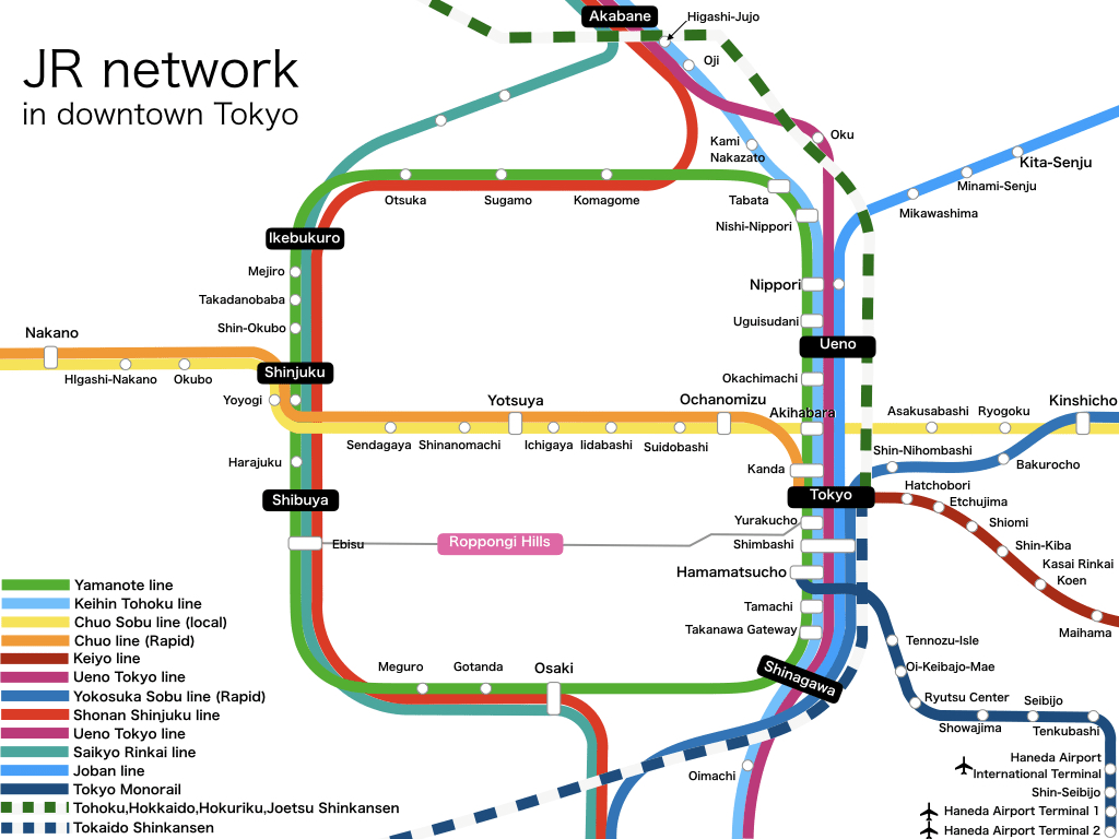 A Yamanote Line se conecta com várias outras Linhas da rede JR e também com o Metrô de Tokyo (não incluso no JR Pass). Uma boa dica é se organizar e saber exatamente quais estações ficam próximas dos lugares que você quer visitar.