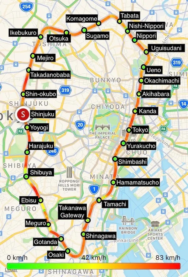 A linha Yamanote percorre 34,5 km em 1 hora, com trens saindo a cada 2-4 minutos aproximadamente durante o dia, chegando a 30 segundos durante os horários de rush.
