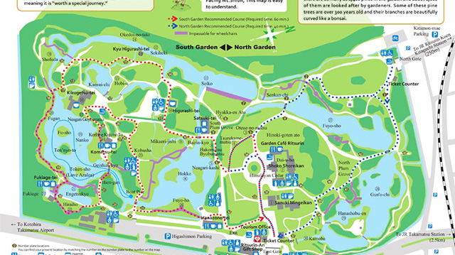 A partir da Estação Takamatsu, o Ritsurin fica a 30 minutos a pé ou apenas 5 minutos se utilizar o trem da linha Kotoku até a estação Ritsurinkoen-Kitaguchi Station, que custa ¥240 (aprox. R$8 – também incluído no JR Pass).