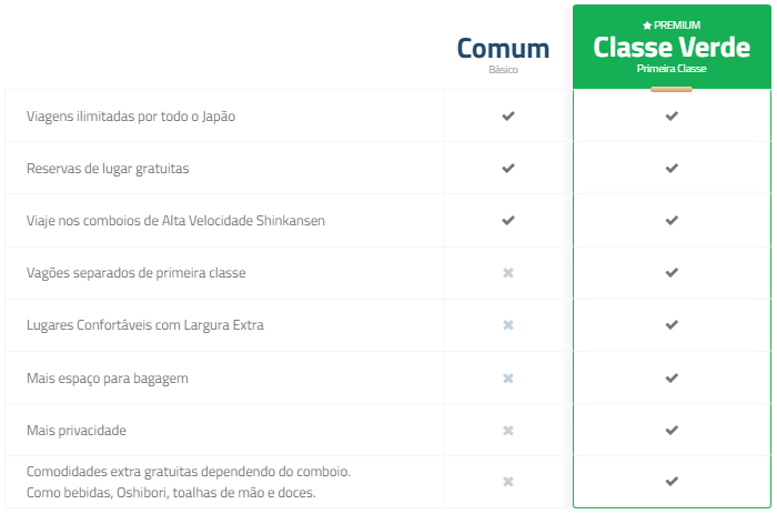 A 1ª Classe na Rede JR (Japanese Railway) é chamada de Green Class, devido ao seu interior luxuoso. A Green Class irá lhe proporcionar a melhor experiência de viagem na rede ferroviária mais confiável do mundo. Aproveite a paz, conforto e sossego extra enquanto explora o Japão.