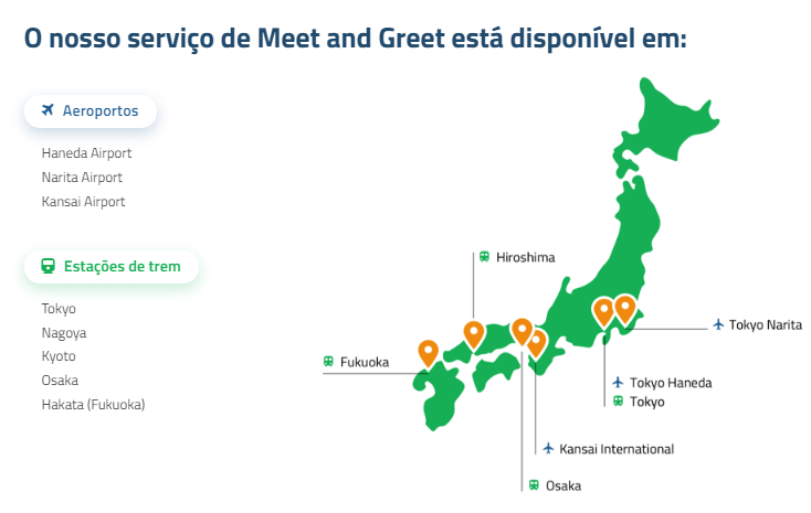 Comece a sua viagem ao Japão da melhor maneira possível com o nosso serviço de Meet and Greet. Estaremos à sua espera assim que chegar, para ajudá-lo a trocar o Japan Rail Passa, tratar de qualquer assunto que precise no aeroporto e acompanhá-lo ao seu meio de transporte.
